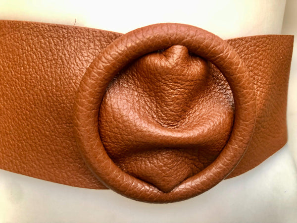 Dark camel brown belt in GENUINE leather. Large round buckle, covered in the same color leather.