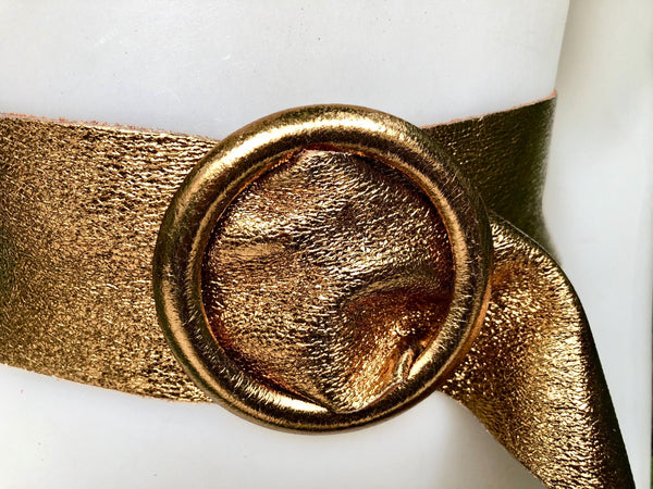 Dark GOLD color wide belt in metallic effect GENUINE leather. Large round metallic buckle in GOLD