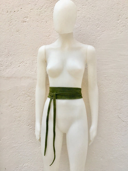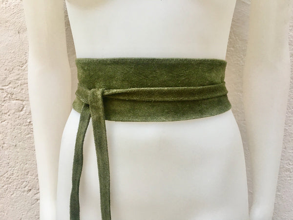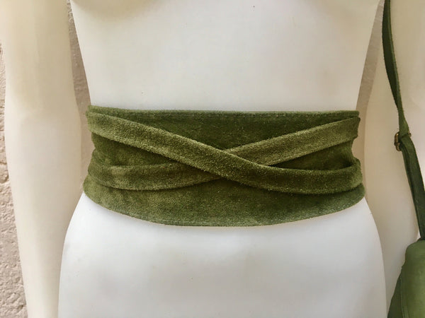 Moss GREEN suede OBI belt. Wrap belt in natural soft suede. Green wraparound belt. Genuine leather boho belt. Green leather waist belt