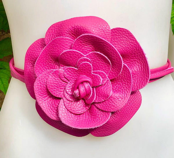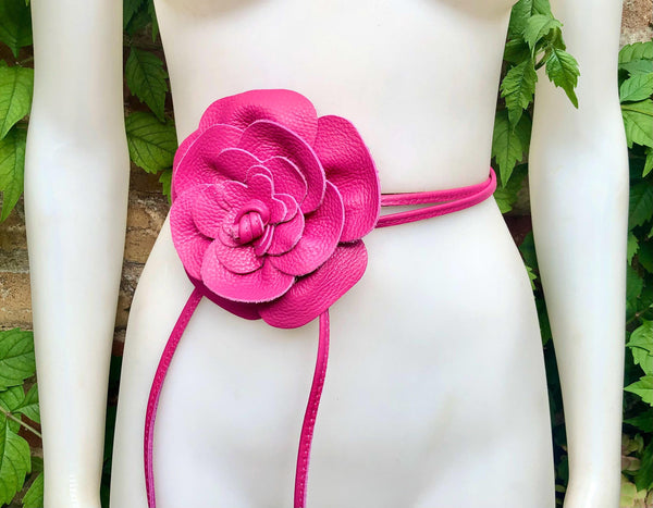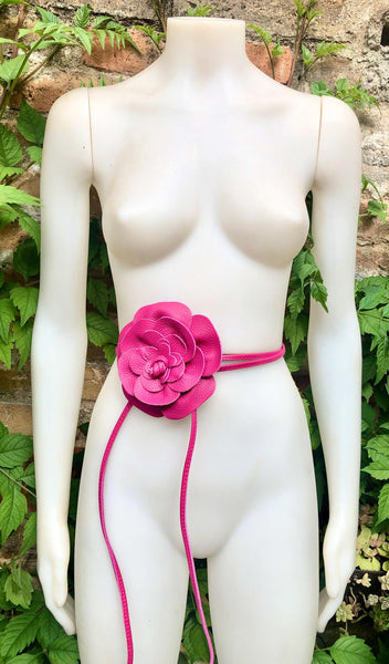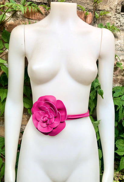 Flower leather belt in hot pink. Made with soft genuine fuchsia pink leather. Magenta pink wrap belt.