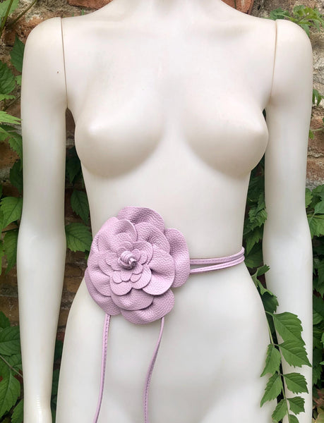 Flower leather belt in light purple. Made with soft genuine light lavender color leather. Mauve wrap belt.
