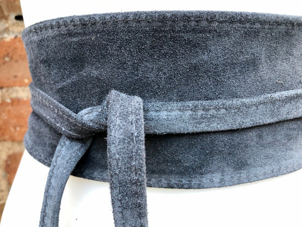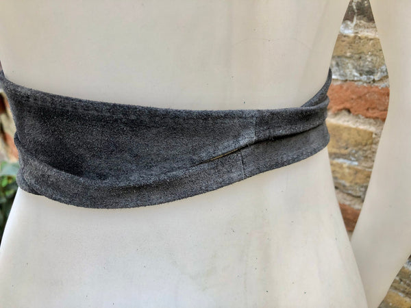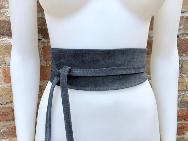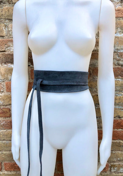 GRAY OBI BELT in natural suede leather. Wide waist belt in soft genuine leather. Soft sueide wrap belt in dark GRAY. This soft wraparound suede belt looks great on a long loose shirt, cardigan or a soft falling dress. Wrap belt in gray. Soft suede leather wide belt