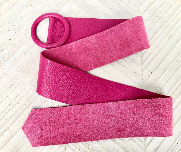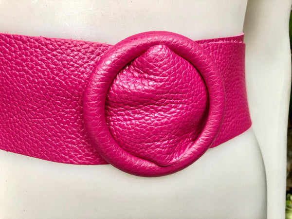 HOT PINK wide belt in GENUINE leather. Large round metallic buckle in FUCHSIA PINK
