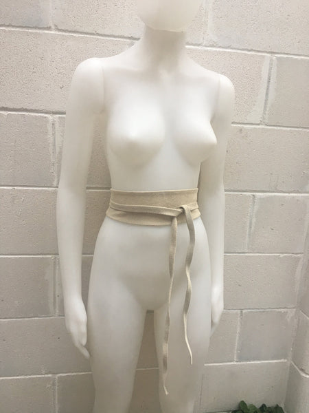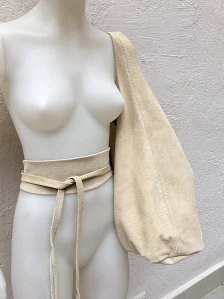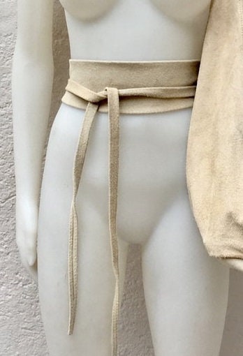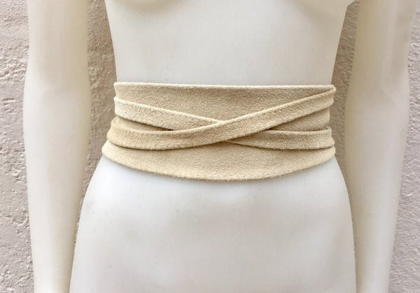 Very light beige obi belt in natural suede leather. Wrap belt in soft natural suede leather. Creamy white suede SASH. Genuine leather waistbelt. Cream color genuine leather suede wraparound belt. This wide waist belt is available in 25 different colors by Good Times Barcelona.