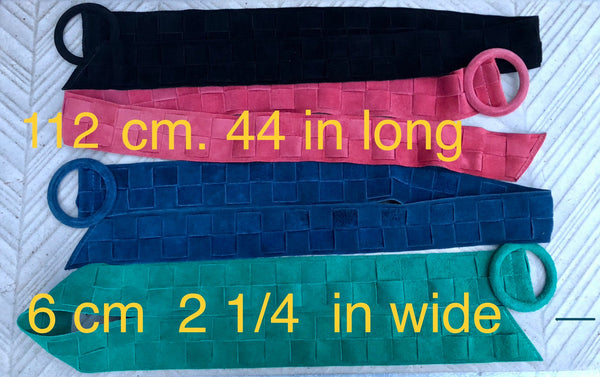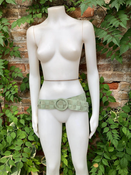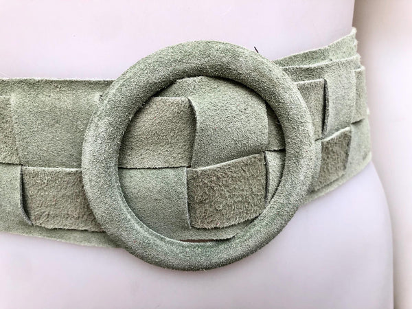 Light GREEN belt in soft genuine suede leather. Large round buckle, covered in the same color suede.