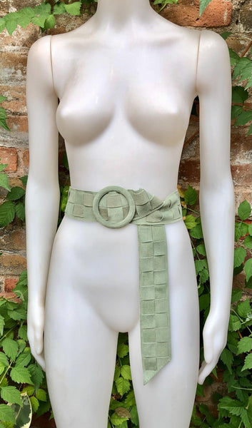Light GREEN waist belt with large round buckle.Mint green boho soft suede wide belt. Genuine natural suede leather. Sage green dress belt