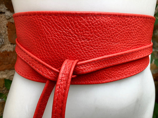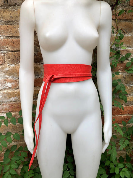 Coral RED OBI BELT in genuine leather. Waist belt in soft natural leather. RED - orange leather belt. Dress or wraparound leather belt.
