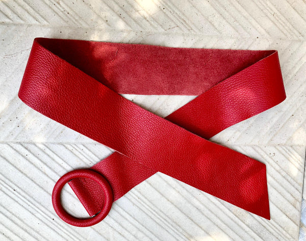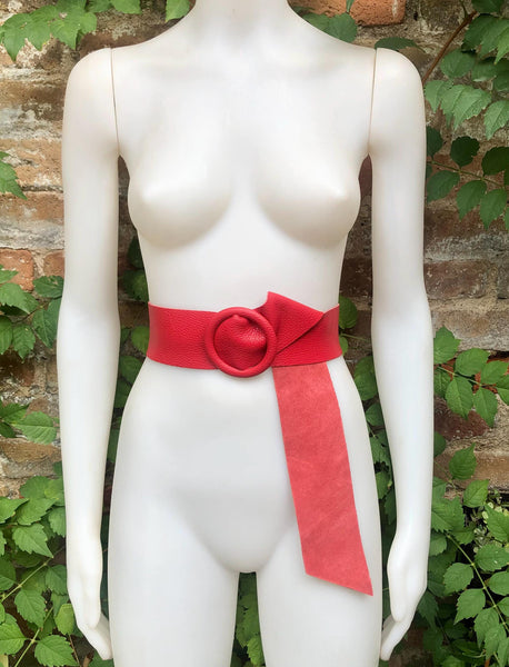 RED leather waist belt with large round buckle. Soft leather belt in RED. Genuine leather bright RED dress belt. Red wide waist belt