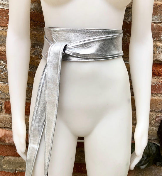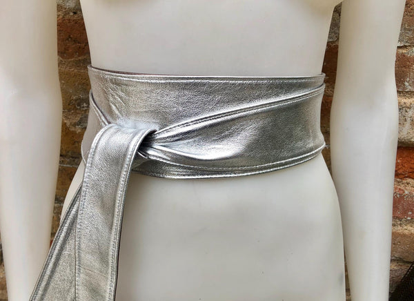 2 SIDED obi wrap belt. BRONZE - SILVER soft genuine leather. WIDER MODEL wrap belt. Genuine leather waist belt in a metallic effect leather