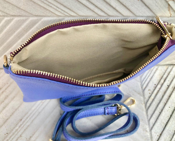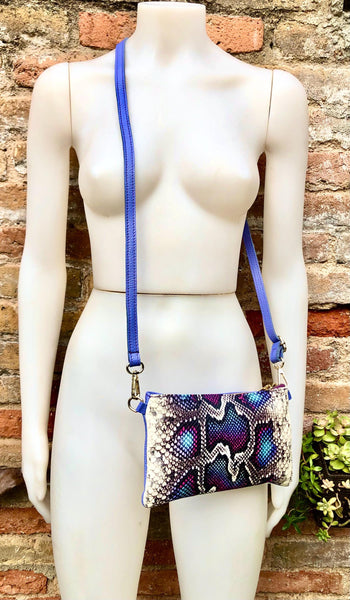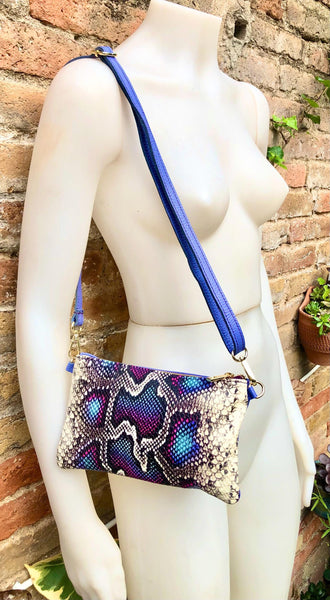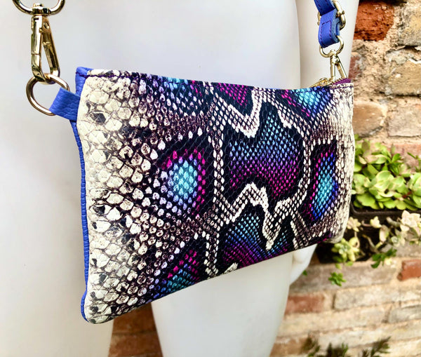 2 sided purple + snake print leather bag. GENUINE leather crossbody / shoulder bag. Small purple purse. Purple, hot pink, black animal print