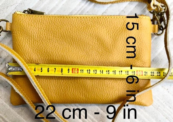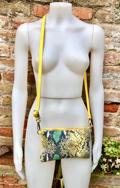 2 sided yellow + snake print leather bag. Crossbody / shoulder bag in GENUINE leather. Small yellow purse. Yellow, black, green animal print
