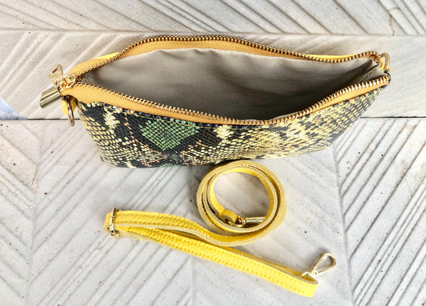 2 sided small leather bag in yellow. One side made with yellow genuine leather and the other side is made with a genuine leather snake print in yellow, green and black.