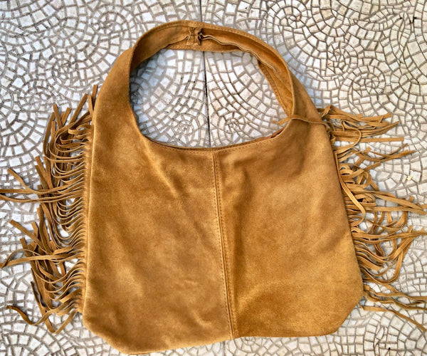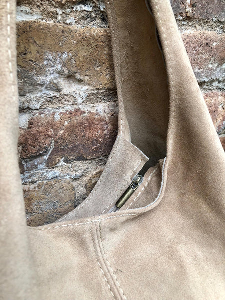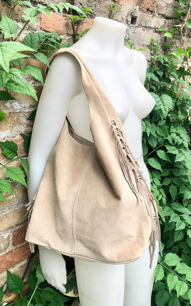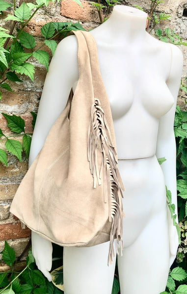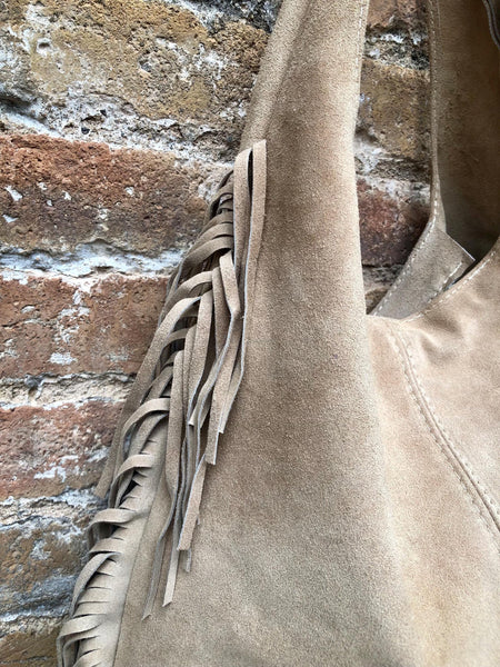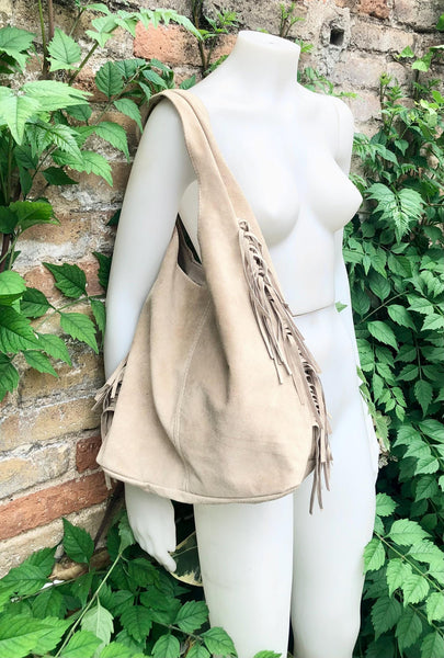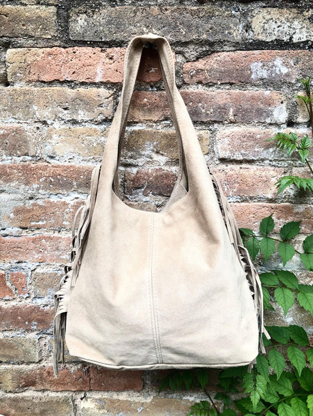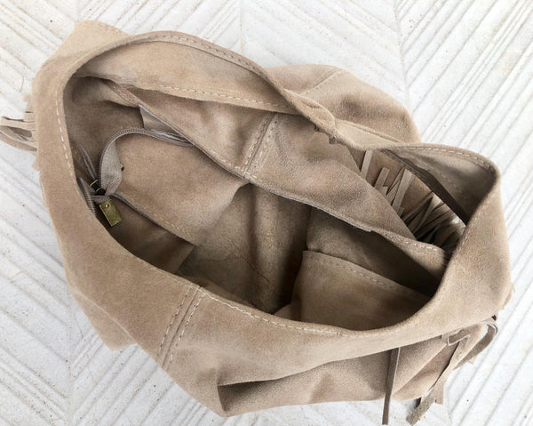 Slouchy bag in soft beige suede with fringes. Soft leather shopper. LARGE tote leather bag in greyge BROWN with zipper. Natural genuine SUEDE leather. NOT LINED. Light tobacco color carry all bag.