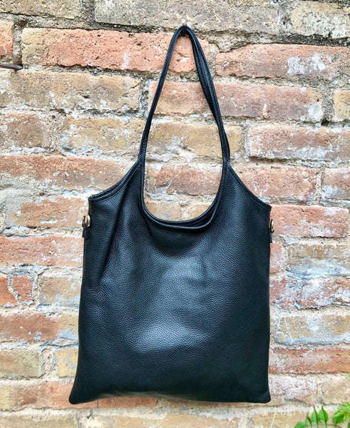 BLACK genuine leather shoulder / crossbody bag. BLACK leather shopper in Soft natural leather. BLACK leather purse. Shoulder + longer strap