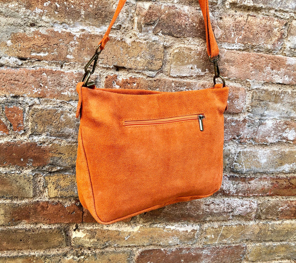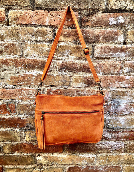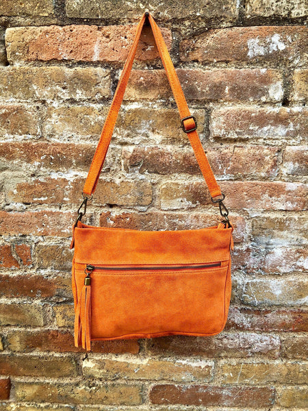 Crossbody suede leather bag in ORANGE with tassel . Orange natural soft genuine leather. Cross over bag with adjustable strap, closed by zipper.