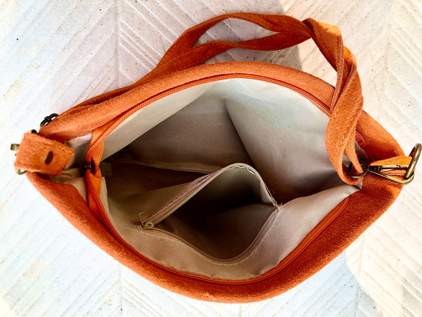BOHO suede leather bag in orange. Soft genuine leather bag with tassel. Orange suede crossbody bag,boho bag, messenger bag in natural suede