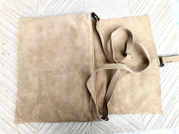 BOHO suede + leather messenger bag in light BEIGE. Cross body bag in BEIGE suede. Soft genuine leather messenger bag. Beige leather purse