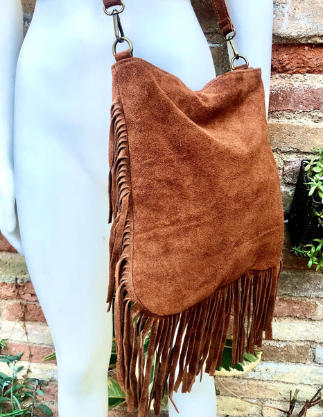 Cross body bag in suede leather with fringes. Rusty brown boho bag . Natural genuine suede leather. Messenger bag. Hippy bag with fringes.