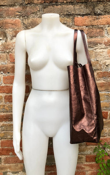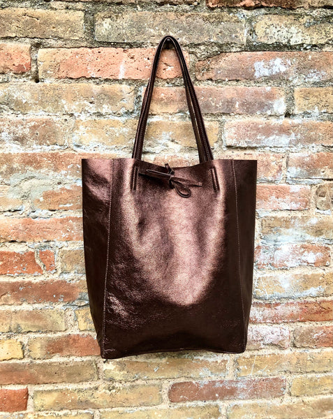 Large tote leather bag in BROWN. Shopper bag. Metallic finish natural GENUINE leather. Large enough for books or a laptop, tablet, cosmetics bag etc. This style is closed with 2 leather straps at the top.