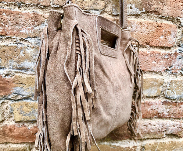 Taupe brown crossbody bag in suede leather with fringes. Greyge brown suede boho bag . Natural genuine suede leather. Hippy suede fringe bag.