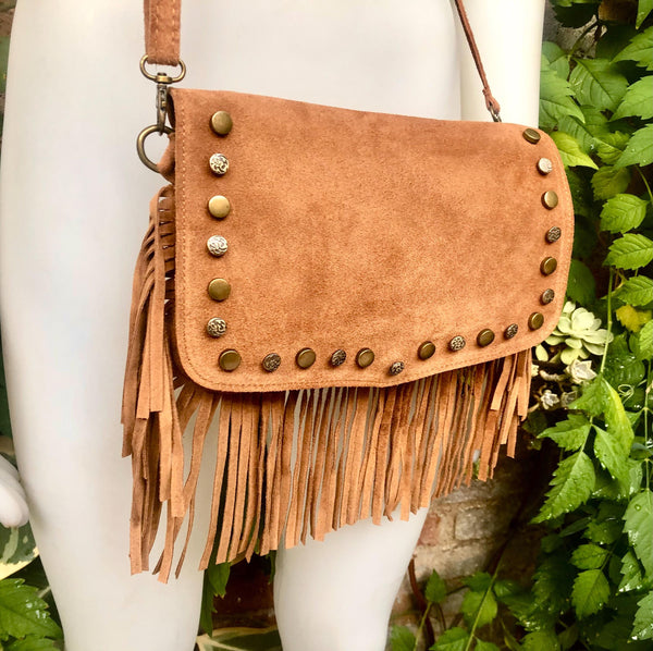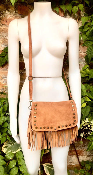 Camel brown crossbody bag in suede leather with fringes and tacks in different designs. Warm tan brown suede boho bag . Natural genuine suede leather. Hippy suede fringe bag.