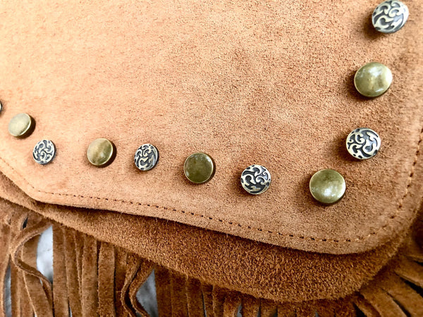Camel brown crossbody fringed bag with tacks.BOHO suede leather bag with FRINGES. Tan brown genuine suede leather. Light brown suede purse