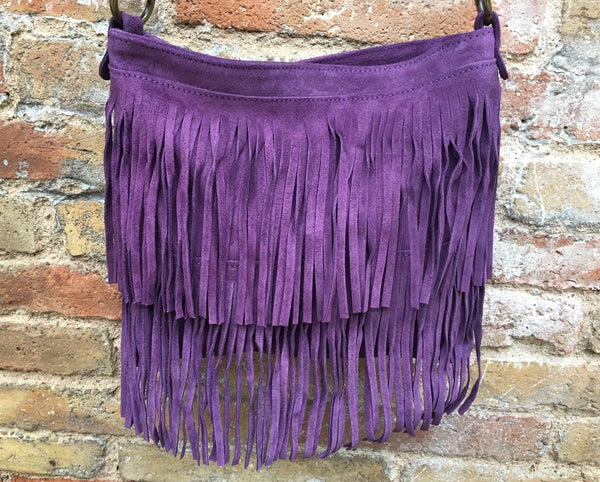 Cross body bag.BOHO suede leather bag in PURPLE with FRINGES. Larger model. Messenger bag in genuine suede. Purple hippy bag in soft leather