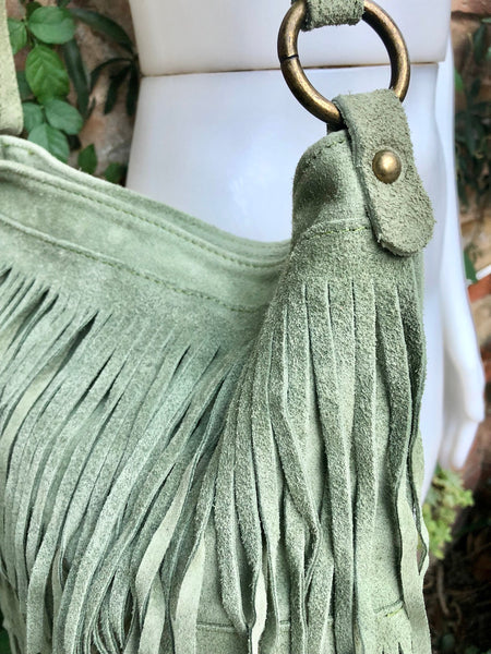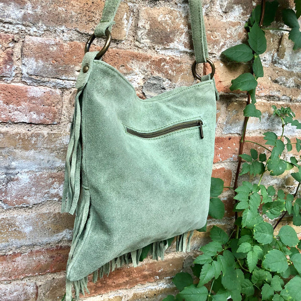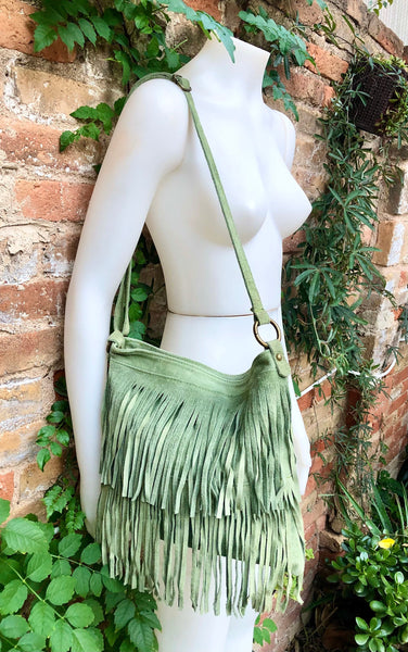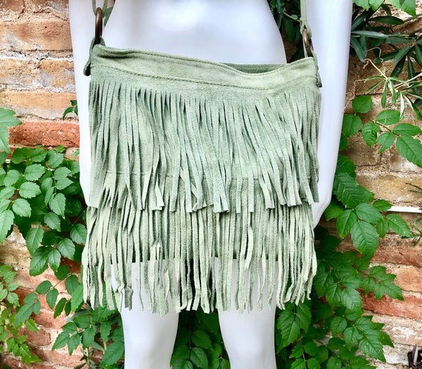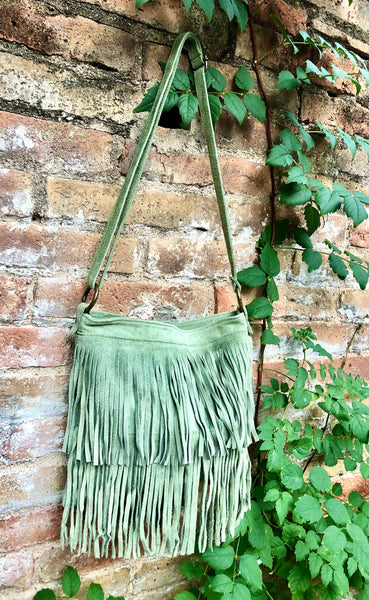 Suede fringed bag. Cross body hippy bag in suede leather with fringes. GREEN boho bag . Natural genuine suede leather. Medium sized messenger bag. Large enough to fit your purse, keys, cellular and small cosmetics bag. Hippy bag with fringes. LARGER MODEL, we also have a smaller suede bag style with fringes in our shop in 10 different colors.