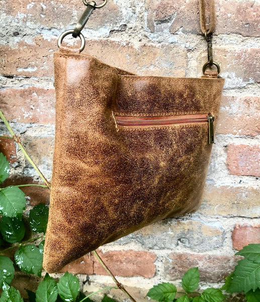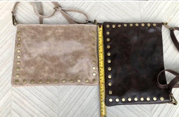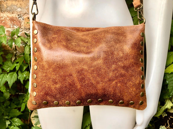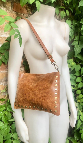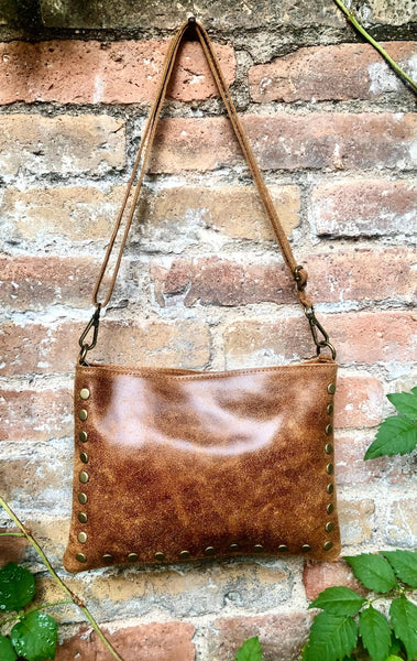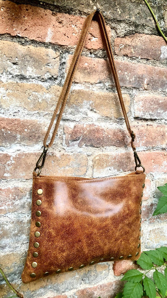 Camel brown cross body or shoulder bag in genuine leather with bronze color tacks at one side . Rusty brown boho bag. Large enough to fit your purse, keys, cellular and small cosmetics bag.