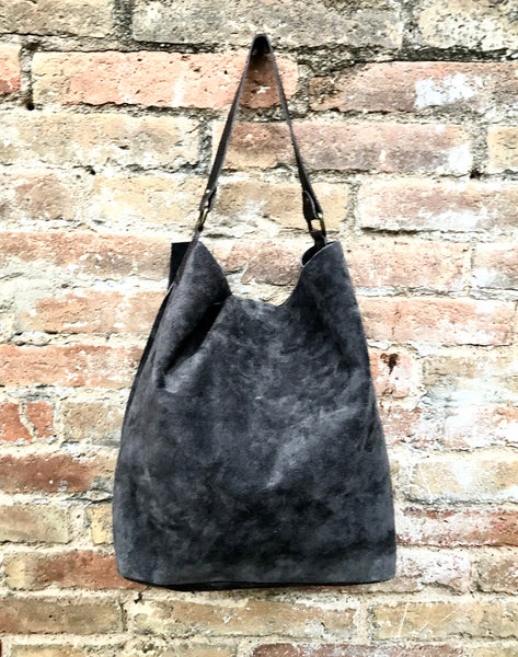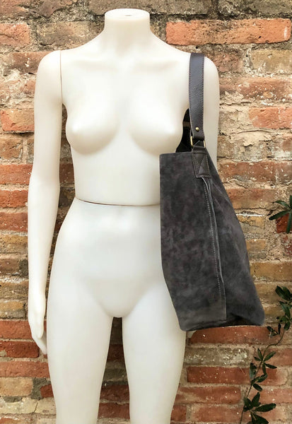 Hobo leather bag in dark gray. Grey slouch bag in genuine SUEDE leather. This shoulder bag is NOT LINED. We added leather zipper pocket inside and a pouch for your mobile phone. Genuine strong but soft leather wide strap in black.