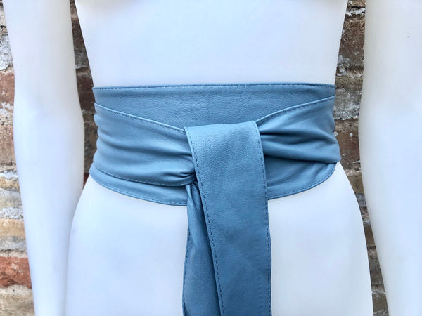 Denim blue obi belt. Wrap belt in soft genuine leather. Wraparound waist belt. Wide style. Blue boho dress belt in blue-gray
