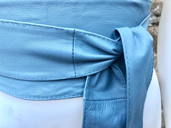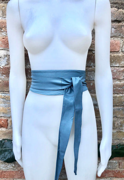 Blue OBI BELT in natural soft genuine leather. WIDER MODEL wrap belt. Genuine leather waist belt. Wide blue - gray dress belt