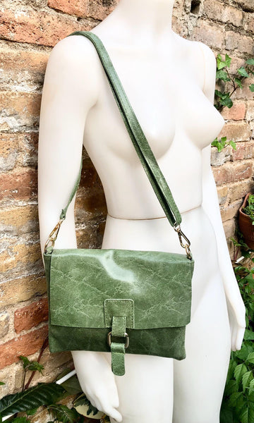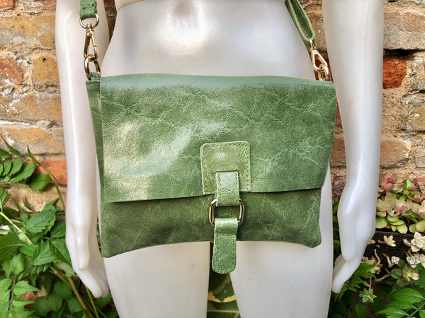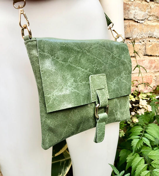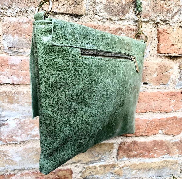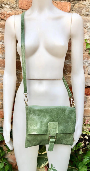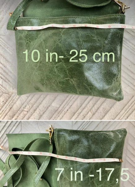 Green crossbody bag. Genuine leather small leather bag. Messenger bag with zipper and flap. Small green leather purse.