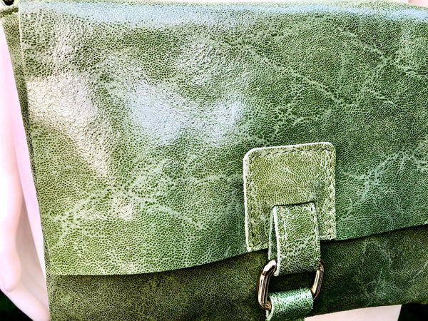 Green crossbody bag in genuine leather. Small messenger bag in glossy laminated leather. Large enough to fit your purse, keys, cellular and small cosmetics bag