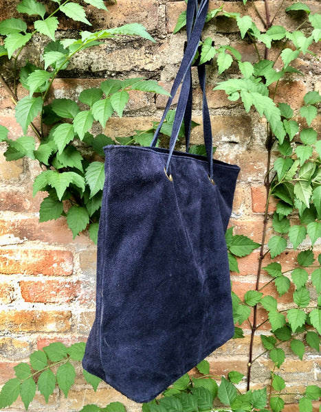 Large TOTE leather bag in navy blue. Soft natural genuine suede leather shopper bag. Dark blue book or laptop shoulder. Navy suede purse