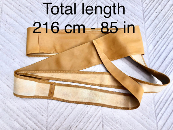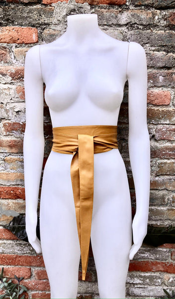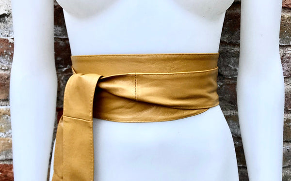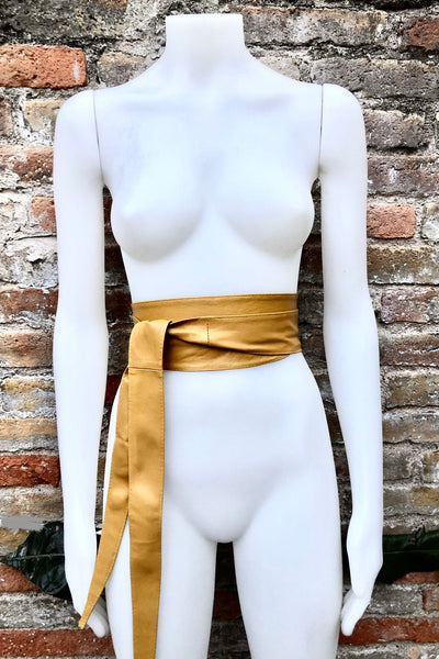 Mustard yellow obi belt. Wrap belt in soft genuine leather. Wraparound waist belt. Wide style. Boho dress belt in yellow
