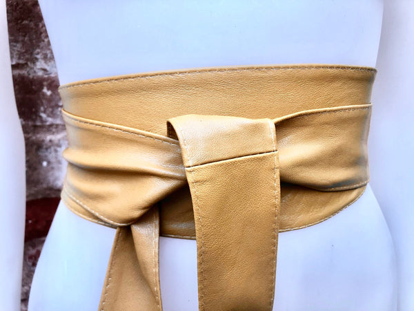 Mustard yellow OBI BELT in natural soft genuine leather. WIDER MODEL wrap belt. Genuine leather waist belt. Wide green dress belt