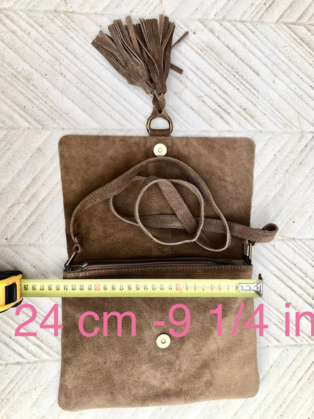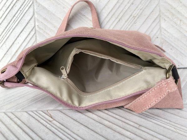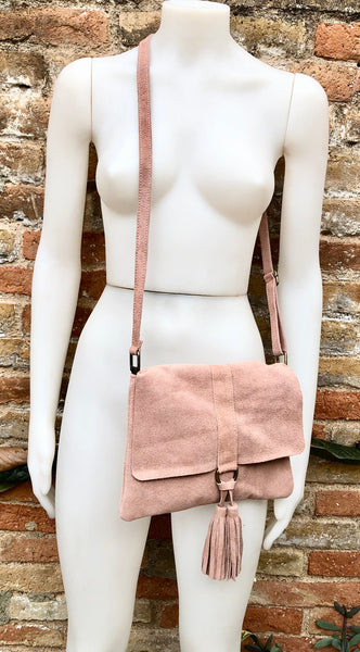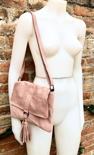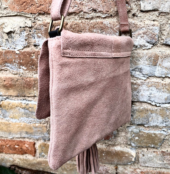 Cross body bag in suede leather .Light pink boho bag. Natural genuine suede leather. Cross over, small messenger bag. Large enough to fit your purse, keys, cellular and small cosmetics bag