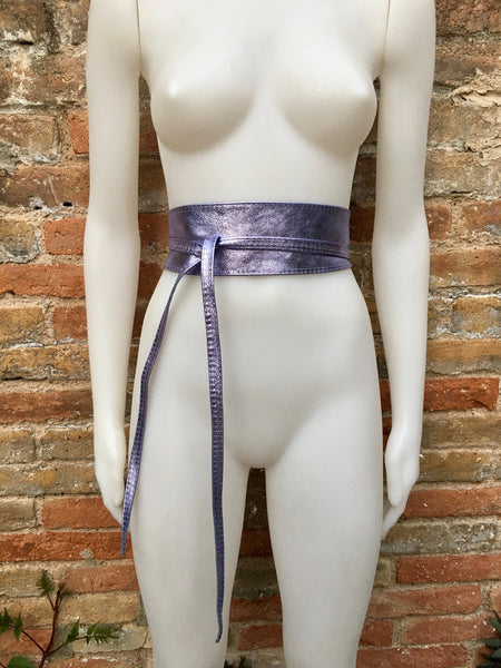 PURPlE color OBI BELT in genuine leather. Wrap belt in soft silver shine leather. Leather SASH . Genuine leather waistbelt.Wraparound boho belt.