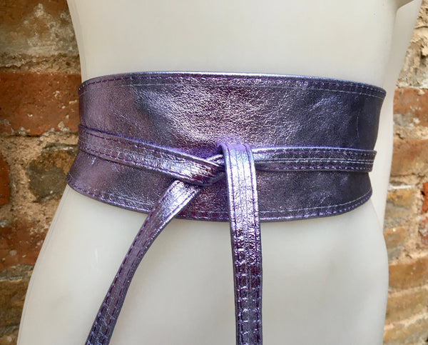 PURPLE leather OBI belt. Wide waist belt in soft genuine leather. Metallic shine wraparound belt, boho dress belt in silver color leather.