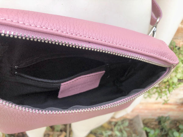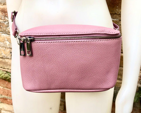 Pink fanny pack . Small crossbody/shoulder bag in natural genuine leather. Small cross body bag or bum pack in light raspberry pink leather.