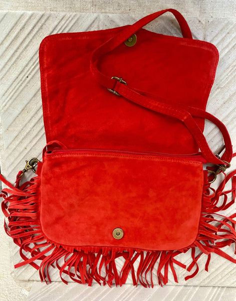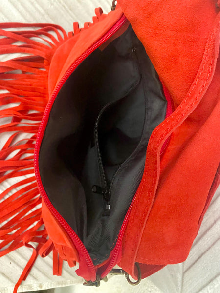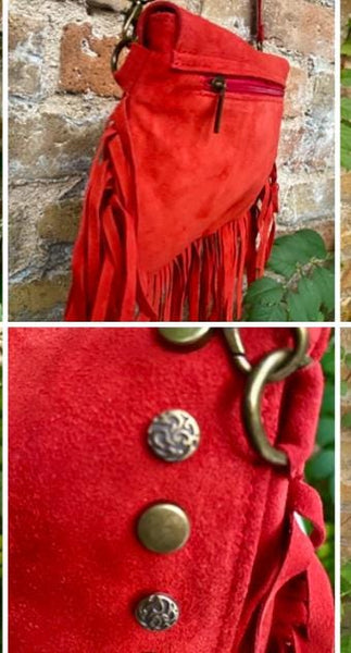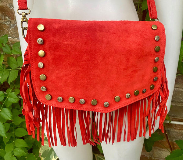Red crossbody bag in suede leather with fringes and tacks in different designs. Red suede boho bag . Natural genuine suede leather. Hippy suede fringe bag.