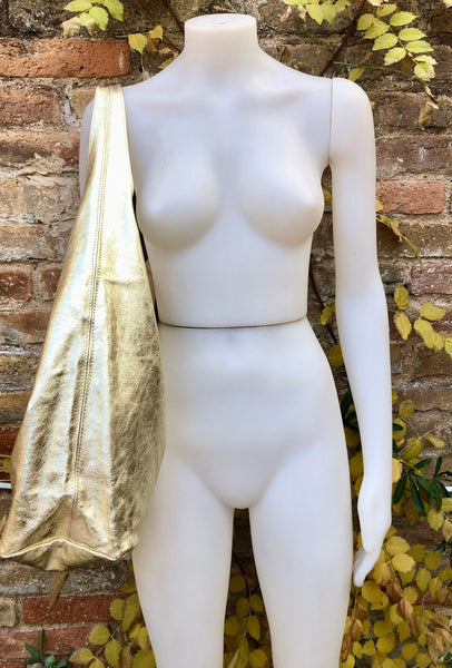 Slouch bag. Tote leather bag in GOLD with ZIPPER. Soft natural glitter genuine leather. Gold leather purse. Metallic leather shoulder bag
