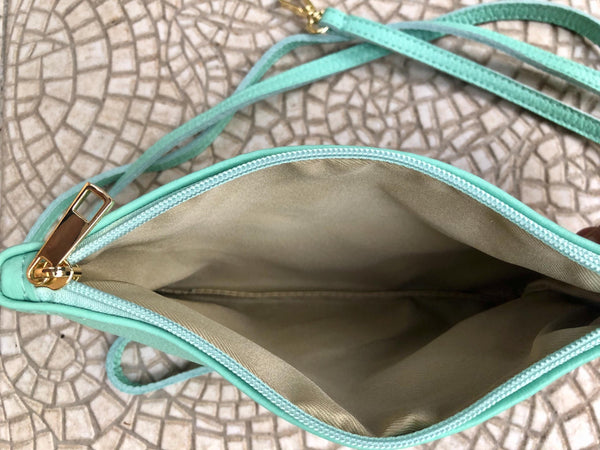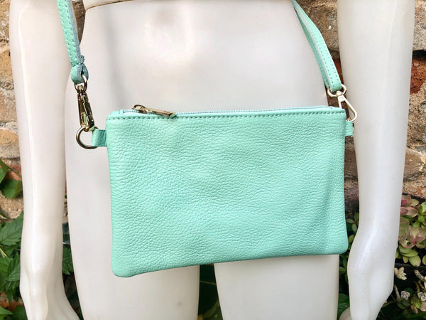 Small leather bag in light aqua GREEN. Natural, soft genuine leather. Cross body or shoulder bag in soft but strong leather. BOHO, Festival cross over bag. Closed with a zipper at the top