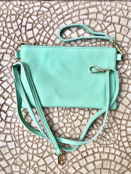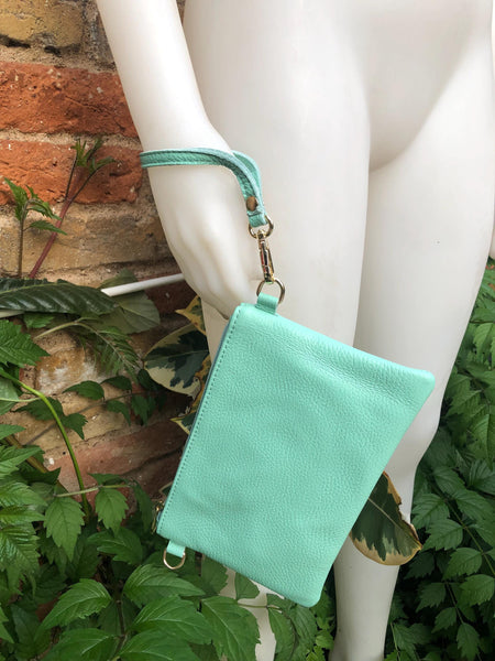 Small aqua green leather bag. GENUINE leather mint crossbody / shoulder bag . Light turquoise green leather purse with adjustable strap.