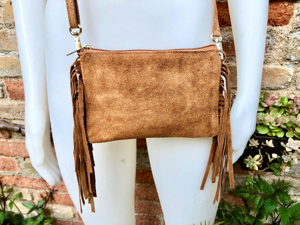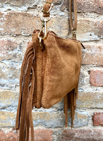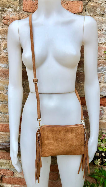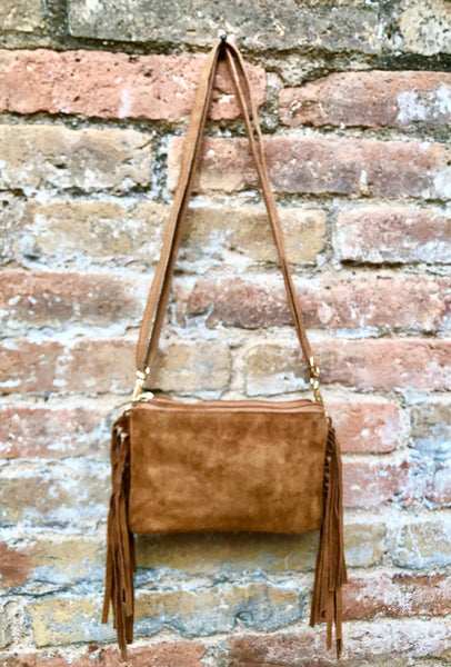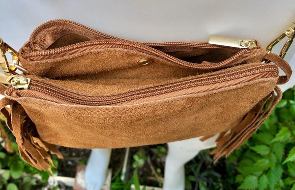 Small camel brown crossbody bag in suede leather with fringes. Light rusty brown suede boho bag . Natural genuine suede leather. Hippy suede fringe bag.