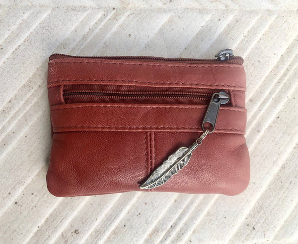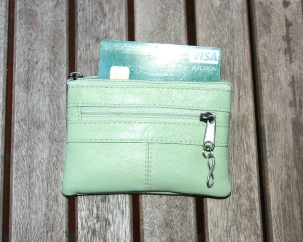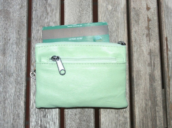 Small genuine leather coin purse in light aqua green, brown, beige or purple . Leather purse or wallet for cards,bills ( folded ) and credit cards, closed with a zipper at the top and 1 more zipper on each side . Soft genuine leather card wallet