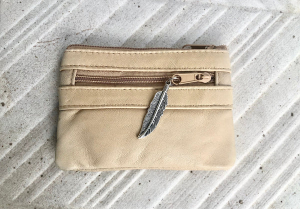Large enough to fit regular credit cards. Metallic feather charm attached to one of the zippers.