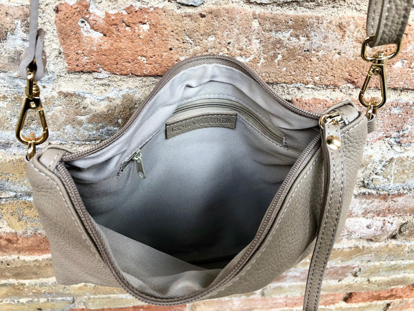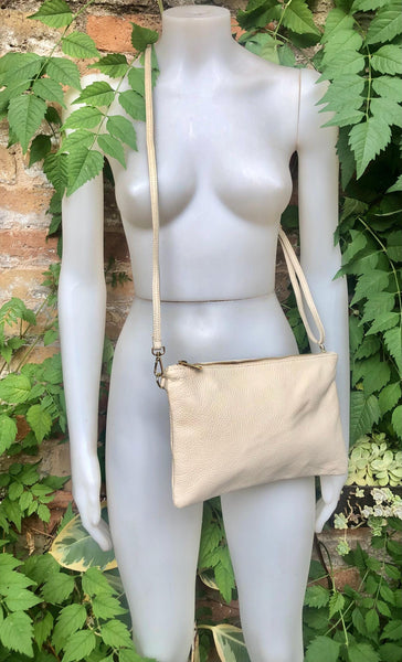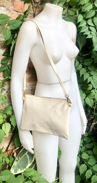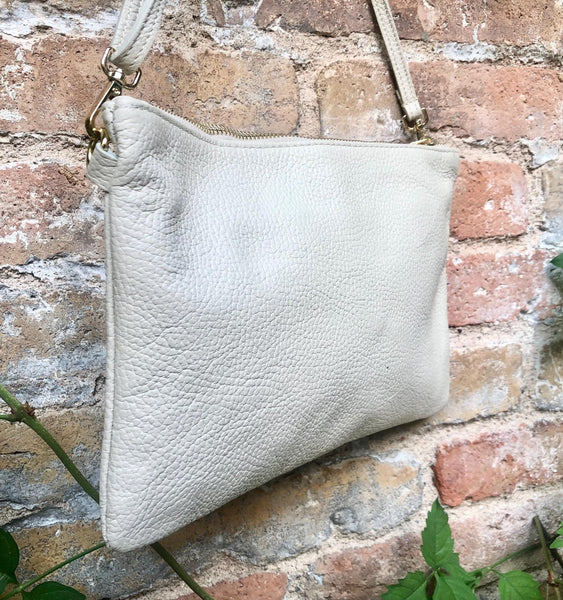 Leather bag in CREAMY WHITE. Natural, soft genuine leather. Small cross body bag in soft but strong leather. Broken white leather purse. Closed with a zipper at the top, lined in a strong nylon-cotton fabric with a pocket inside.