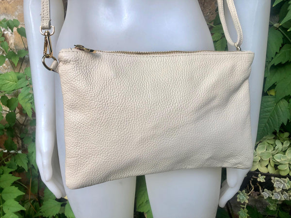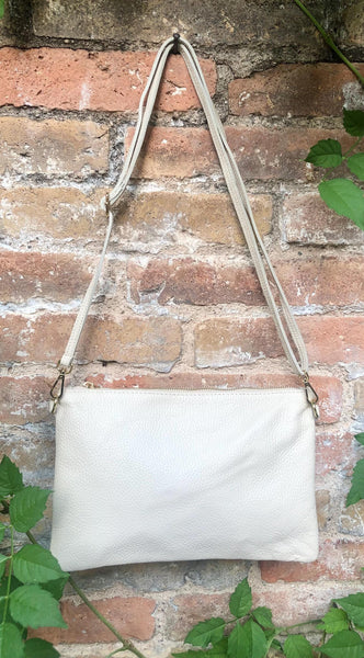 Small leather bag in CREAM WHITE. Crossbody / shoulder bag/ wristlet in GENUINE leather. Adjustable strap and zipper. Broken white purse.
